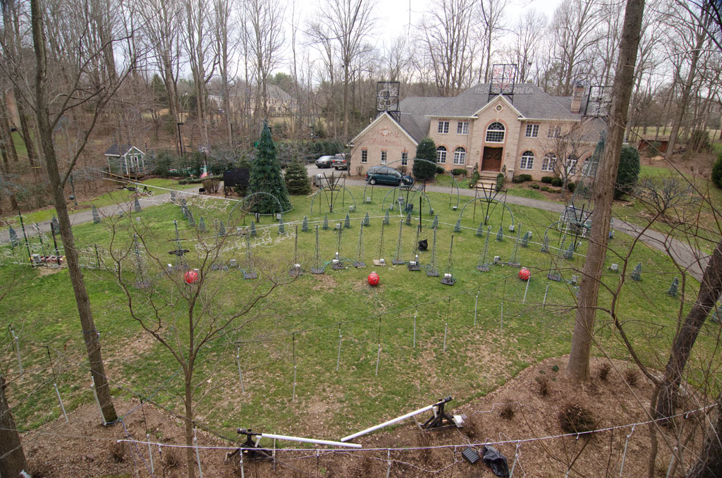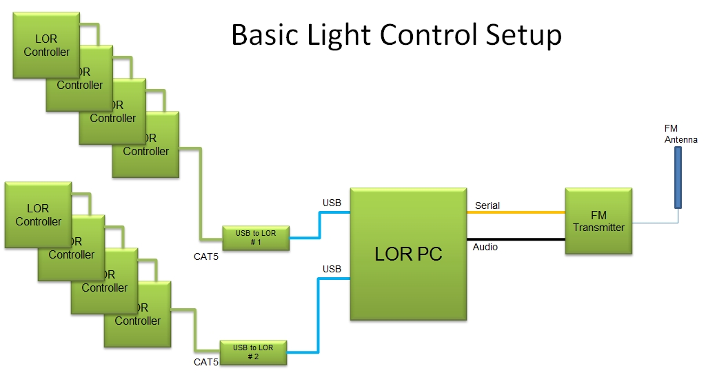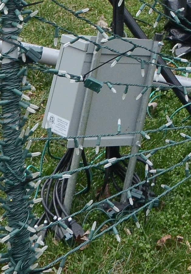 During the show, the computer sends commands to the control boxes for each of the different outlets as often as 100 times per second. At the same time, the computer is sending the music to a low power FM transmitter so that visitors can listen to the music from the comfort of their car. We also use several outdoor speakers so that the music can be heard in front of the house.