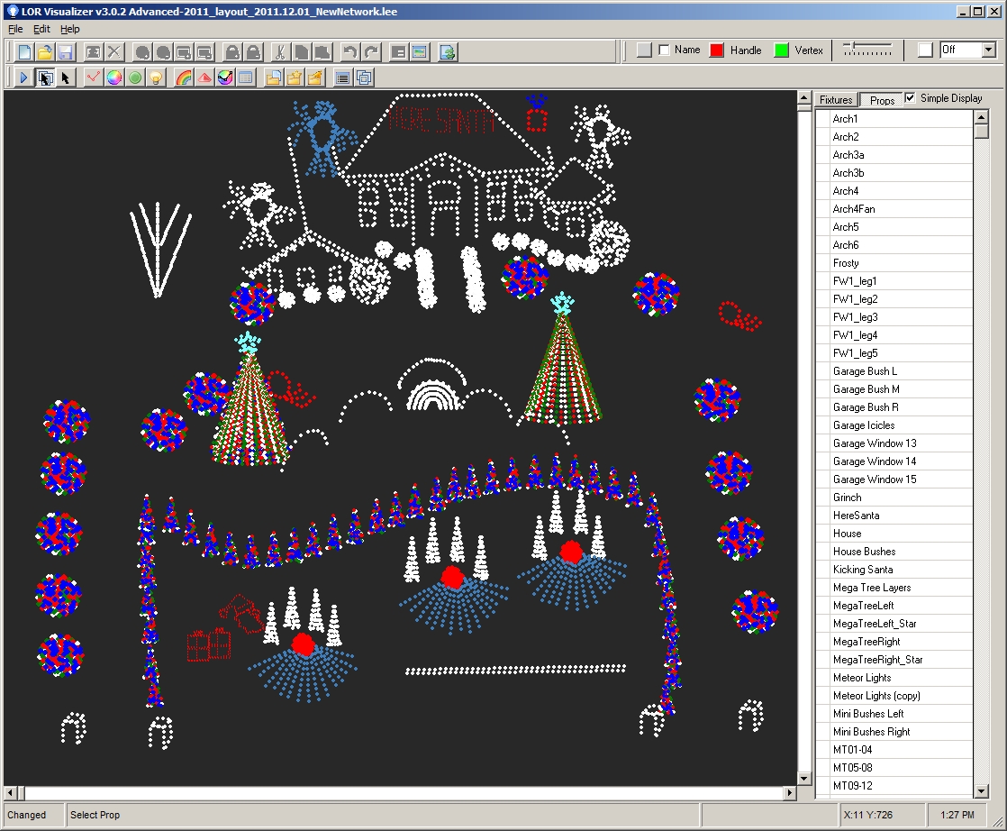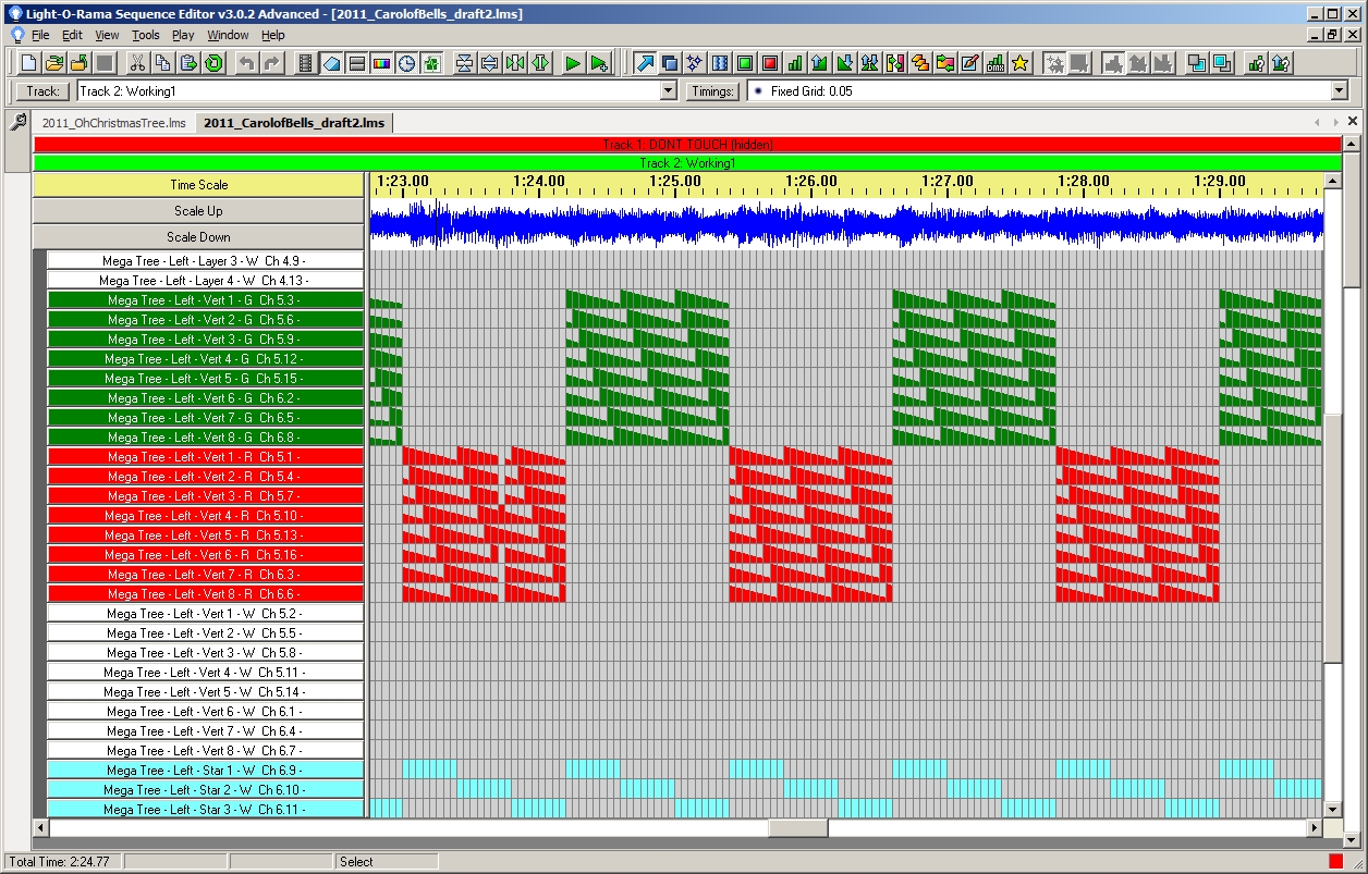 To program the lights to flash, fade, twinkle, change color, etc. The Light-O-Rama sequencing software allows you to load the music file into a time grid. There is a row for each channel. In each row you program the lights as you wish. The software also provides a Visualization tool which allows you to get an idea of what the display will look like without actually having to run out into the yard to see how it looks. This allows us to program any time that we want, not just when the lights are up. See the pictures below of the sequencing and visualization tools.